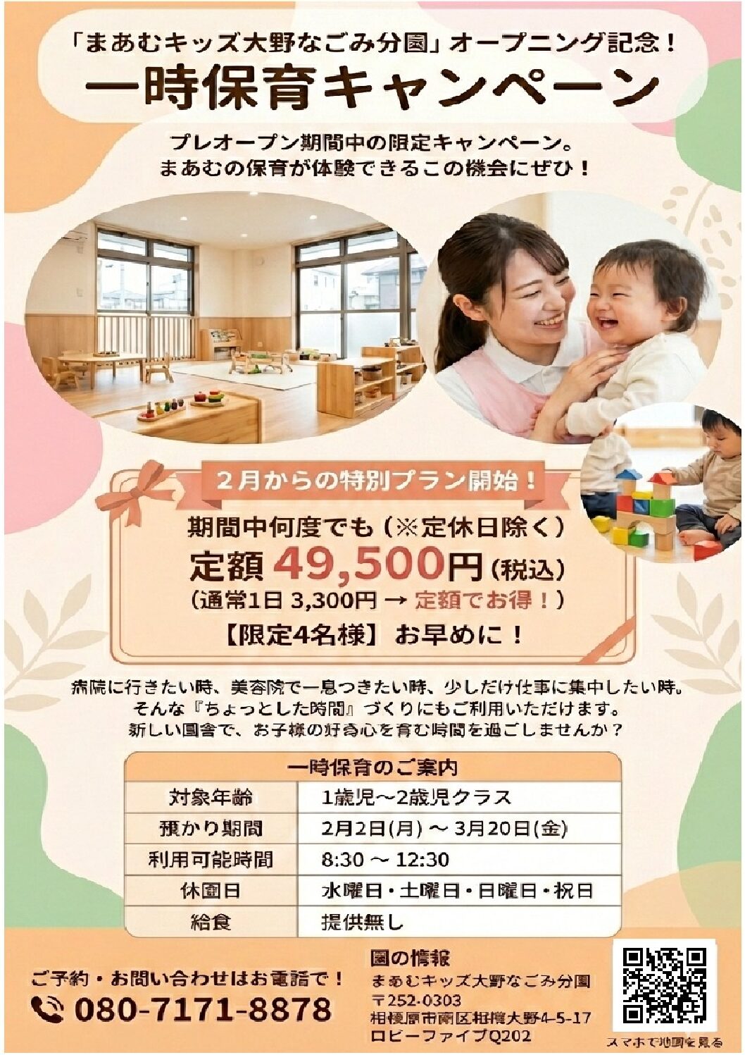 1歳~2歳児対象の一時保育定額キャンペーンを実施いたします!