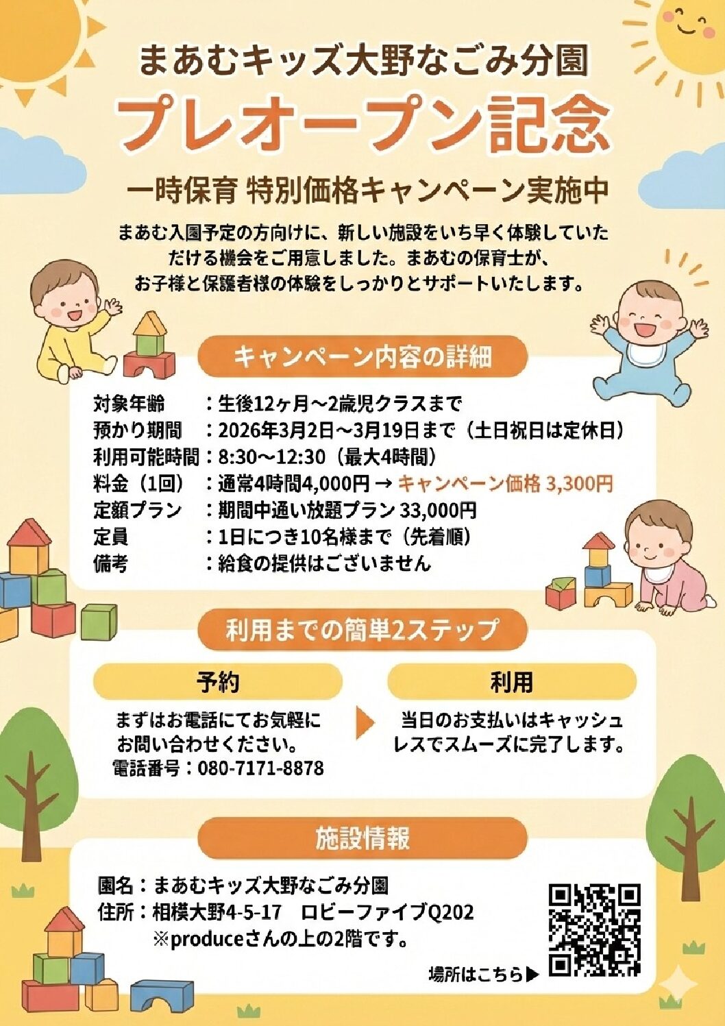 空き状況、ご予約は℡080-7171-8878へご連絡ください。まあむ入園予定の方以外もご利用いただけます。